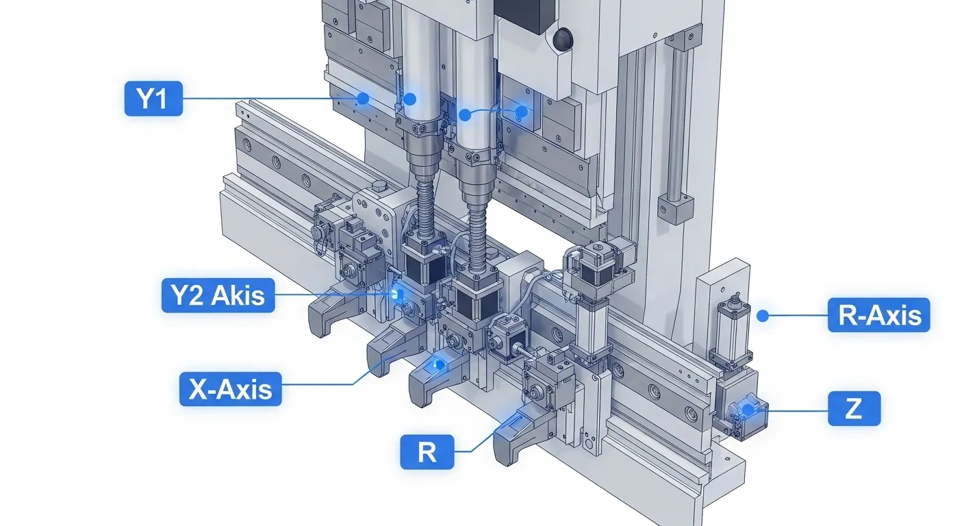 - Y1/Y2: Independent control of the left and right cylinders for ram positioning.