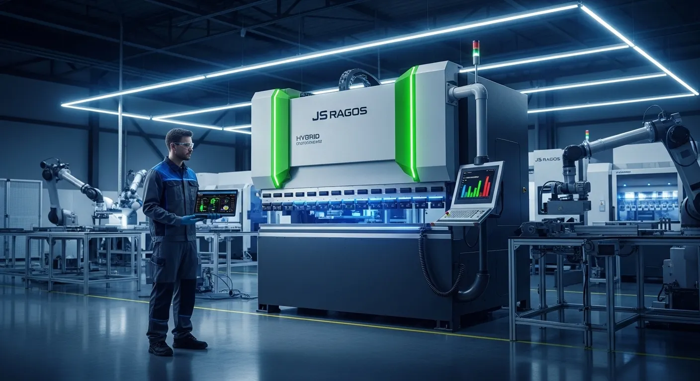 If your shop requires the heavy tonnage of a hydraulic system (up to 600T) but wants the efficiency of a servo-motor, the JS Ragos Hybrid CNC Press Brake is the industry answer. These machines use a servo-pump system that only activates the hydraulics when needed.