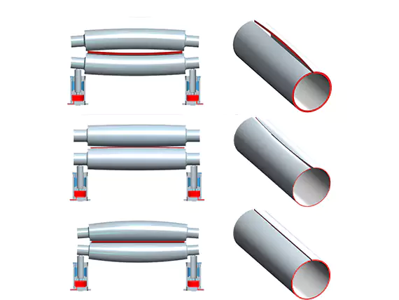 During the bending process, the pressure applied to the rolls can cause slight deflection in the center, leading to uneven curvature or flat zones along the plate. To eliminate this, our machines are equipped with a precision-engineered crowning compensation system.